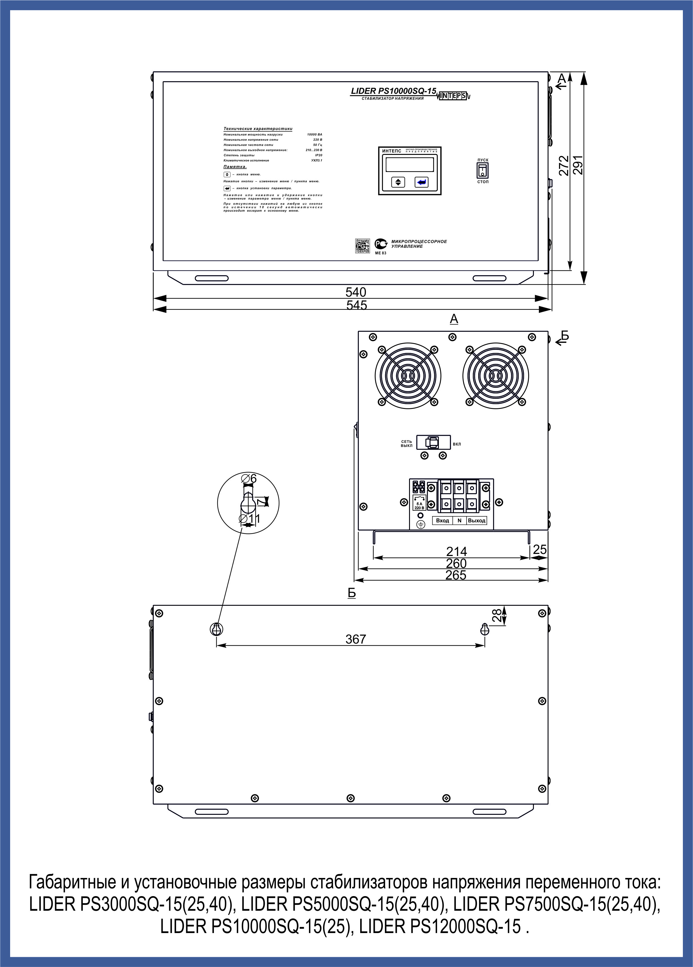 Байпас автоматический встроенный    АБП для стабилизаторов PS 5000-12000 SQ