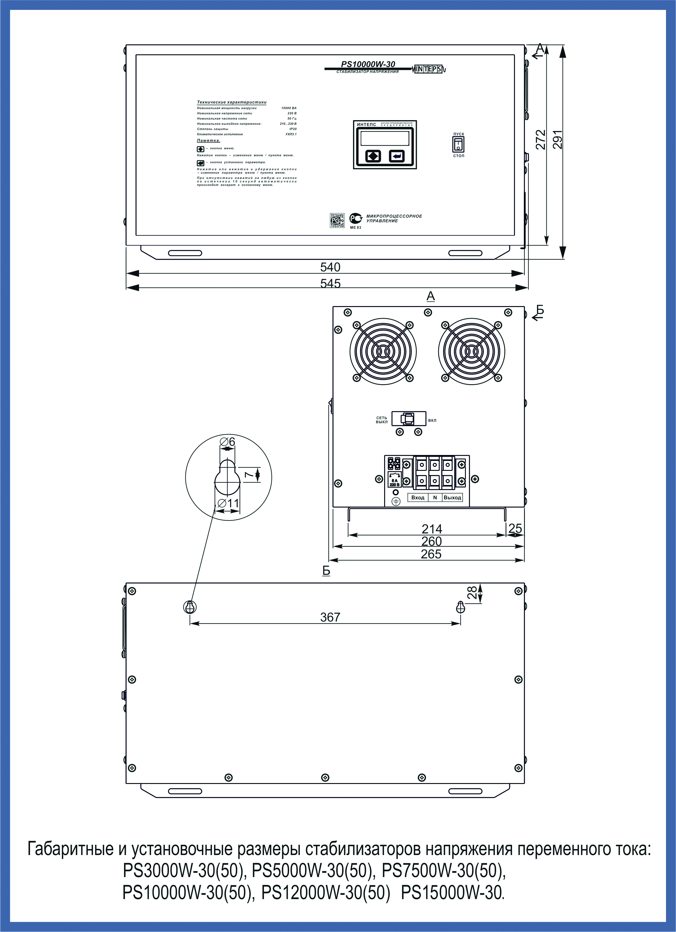 Номинальная мощность нагрузки, ВА / ток нагрузки, А..... 15000 / 68.2